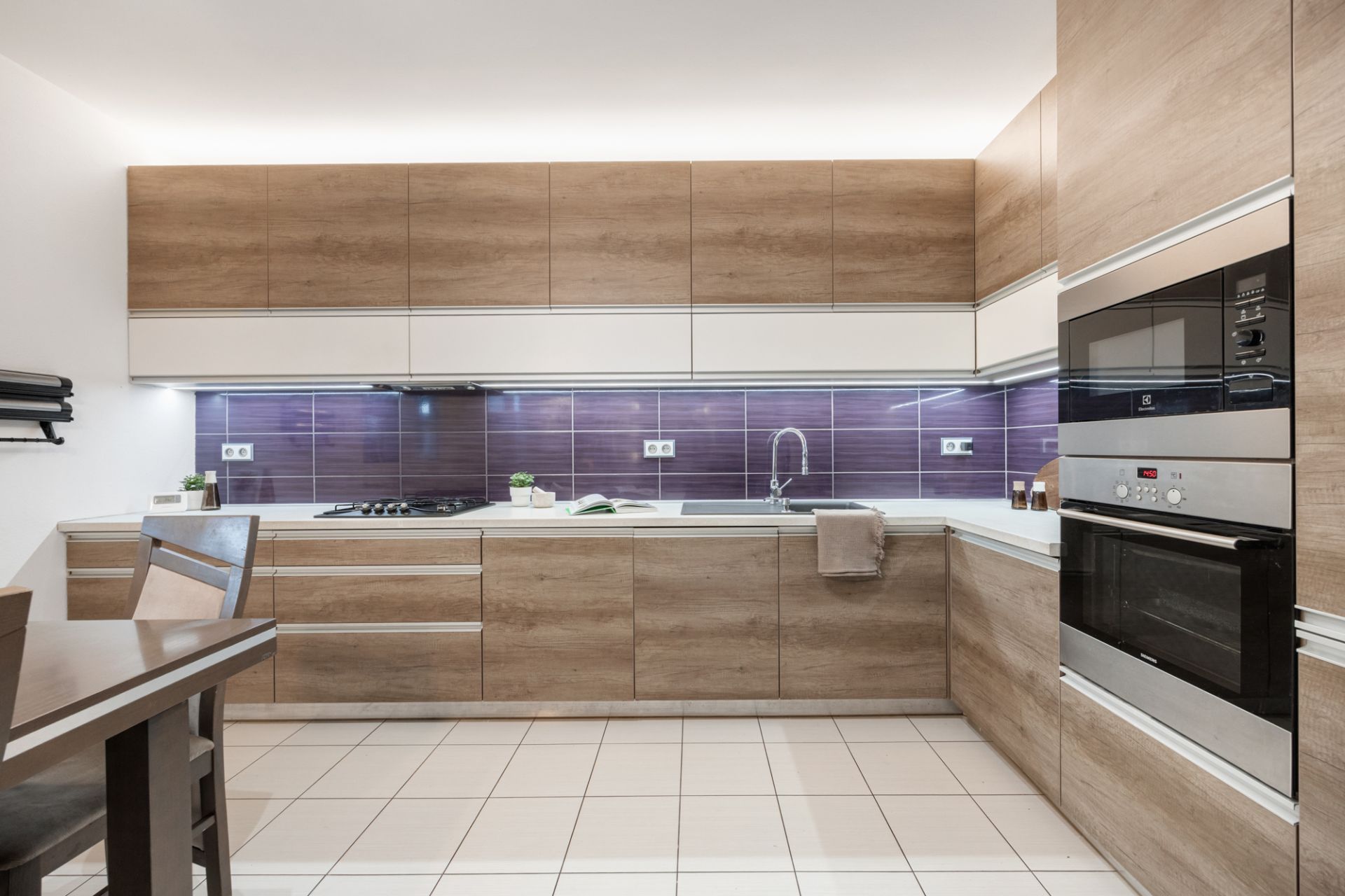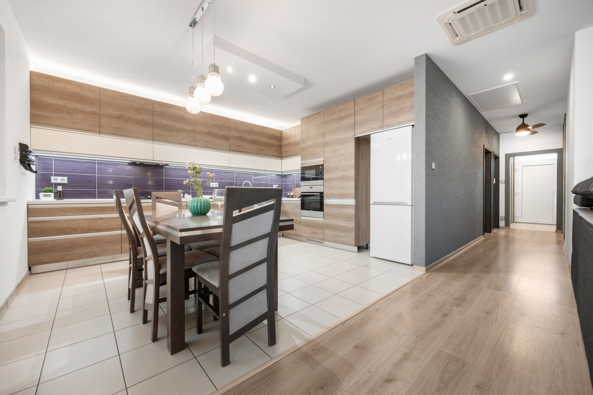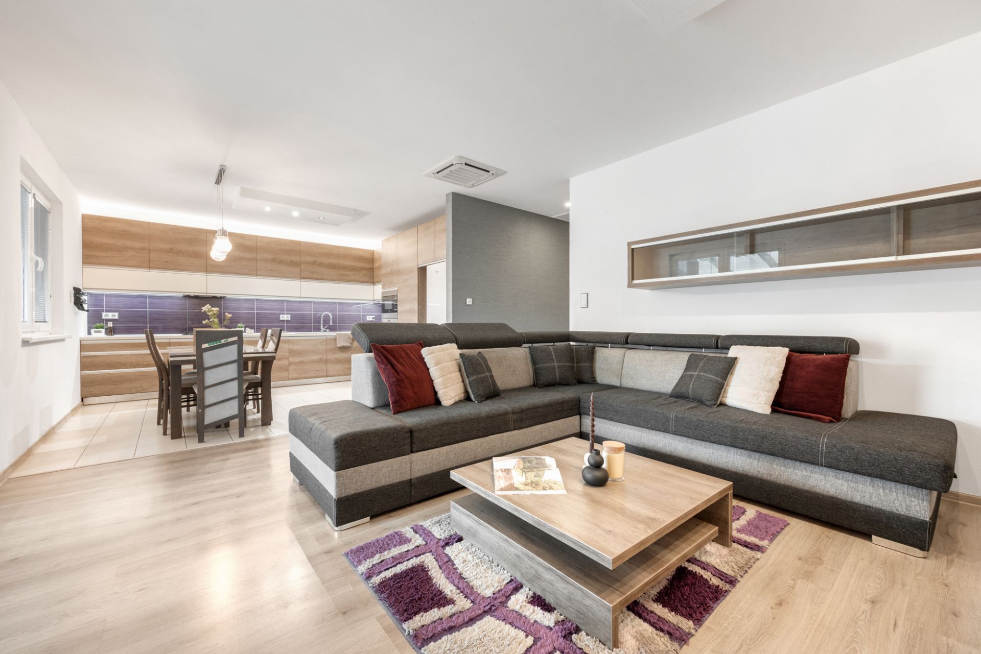 Srdcom domu je priestranný otvorený denný priestor, ktorý prepája obývaciu izbu s krbom, jedáleň a modernú kuchyňu na mieru so vstavanými spotrebičmi.