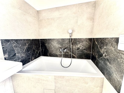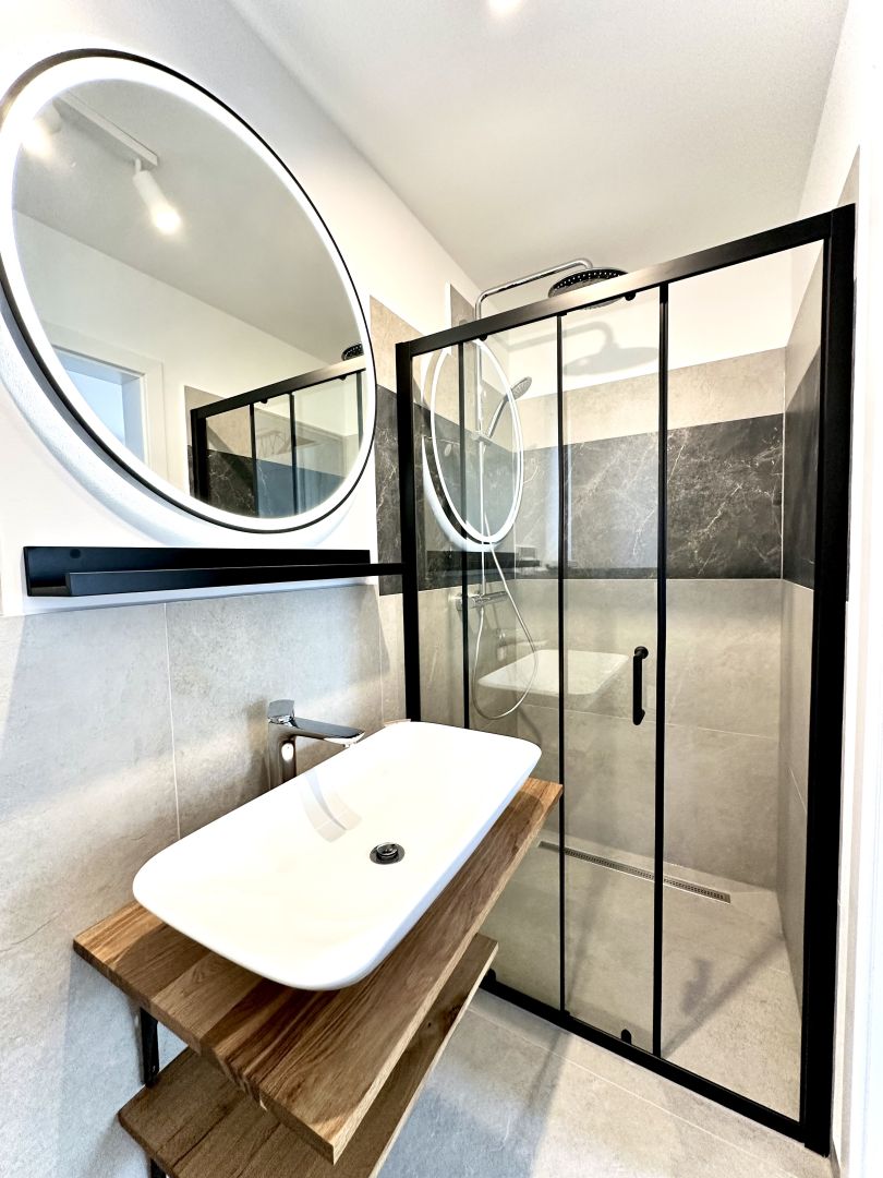 - kúpeľňa so sprchou: gresová obklad, dlažba, dizajnové umývadlo s batériou zn. KLUDI s dreveným policovým systémom a držiakom na uterák, chrómová odtoková súprava a umývadlový sifón; veľké kruhové zrkadlo s LED podsvietením a poličkou; SPRCHA s posuvnými dverami, rámové konštrukcie sprchy povrchová úprava matná čierna, prvotriedny sprchový systém zn. GEBERIT (termostatická batéria s prepínačom, hlavová sprcha a ručná sprcha s troma sprchovými prúdmi); závesné WC zn. GROHE s predstenou, poličkou, nádržkou, tlačidlom, soft close sedátkom a doskou