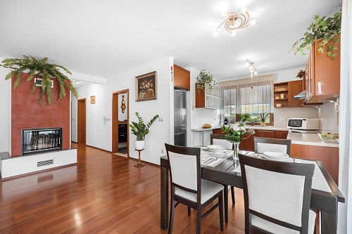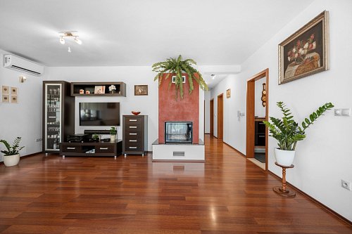 Interiér domu je navrhnutý s dôrazom na funkčnosť a komfort. S úžitkovou plochou 140 m2 nájdete štyri priestranné spálne, obývaciu izbu prepojenú s jedálňou a kuchyňou, ako aj hosťovské WC so sprchovým kútom. Samostatná kúpeľňa a oddelené druhé WC zabezpečujú maximálne pohodlie pre celú rodinu. Obývacia izba je vybavená akumulačným krbom, ktorý vytvára príjemnú atmosféru a poskytuje efektívne alternatívne vykurovanie. Pre váš komfort sú k dispozícii aj dve klimatizácie, ktoré zabezpečia príjemnú teplotu počas horúcich letných dní.